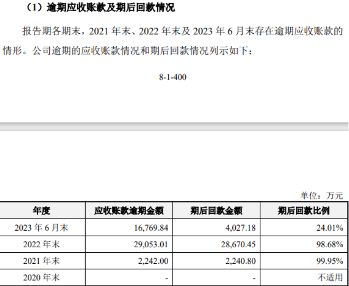 不难看出,2021年末和2022年末,期后回款比例分别为99.95%和98.68%,而今年上半年则仅为24.01%。
