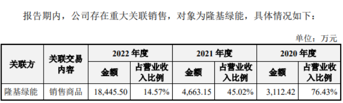 (3)晶科能源控股股东通过上饶长鑫持有发行人2.36%股份;2022年公司第五大客户林洋能源通过全资子公司林洋创投持有发行人0.26%股份;(4)报告期内发行人向隆基绿能销售光伏电池片制造需要的镀膜设备、热制程设备和自动化设备等,销售金额分别为3,112.42万元、4,663.15万元及18,445.50万元,占营业收入比例为76.43%、45.02%和14.57%;(5)发行人对隆基绿能销售的部分设备未处于与非关联方交易价格区间,主要原因系2020年及2021年,发行人对隆基绿能自动化设备销售单价高于非关联方,主要是因为2020年和2021年自动化设备基本均为外购,而外购自动化设备成本较高。发行人对隆基绿能的部分销售产品没有非关联方价格比对。