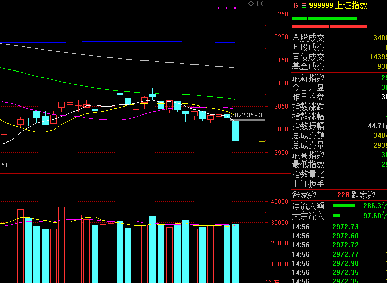 今天A股又是一个割韭菜的交易日,自从开盘小幅低开后一路震荡下滑,完全进入空头走势,多头毫无反击之力;尤其午盘出现一波跳水,上证跌至2994点,指数、板块和个股全线下跌,让投资者再度亏损。