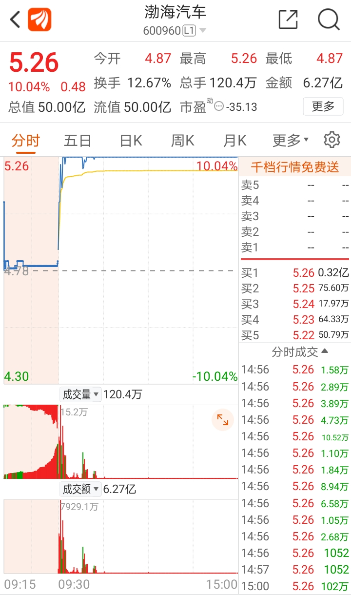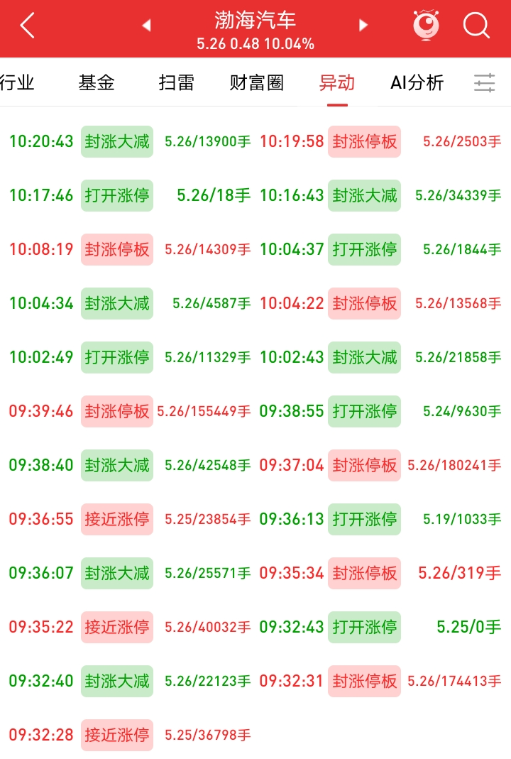 2、渤海汽车是有板块效应的,加上它启动比较早,本来能在10点前稳定住涨停隔日是有连板概率的,毕竟今天汽车产业链几个首板票,9点40分以前有异动且10点前封板成功的算前排,而渤海汽车相对来说明天就要往后排了。