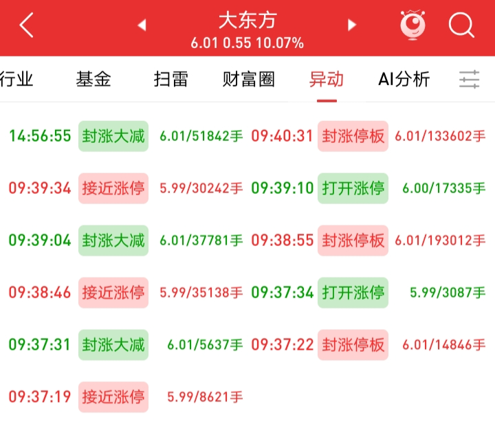 3、从上图看,大东方确实在第一封触板后迅速炸开,但一分钟再次封住涨停板,之后再打开了一次,最后在9点40分封住涨停板,在这段时间内都是可以介入的时机,就看你能不能把握住。