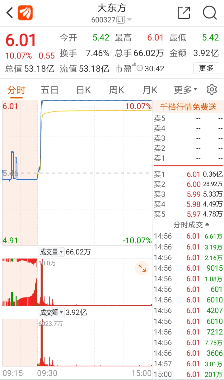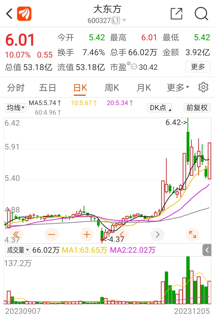 2、大东方前面有个压力位,就是上个涨停板次日的高点6.42,看筹码确实还有部分套牢盘,所以明天上冲不能过的话要注意双顶的情况,如果能快速突破大概率会有连板。