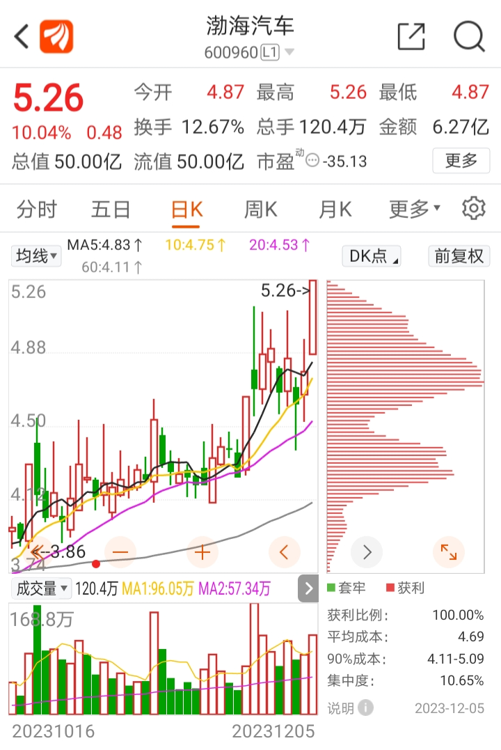 $渤海汽车(SH600960)$ (热门板块的N型上攻换手涨停板)