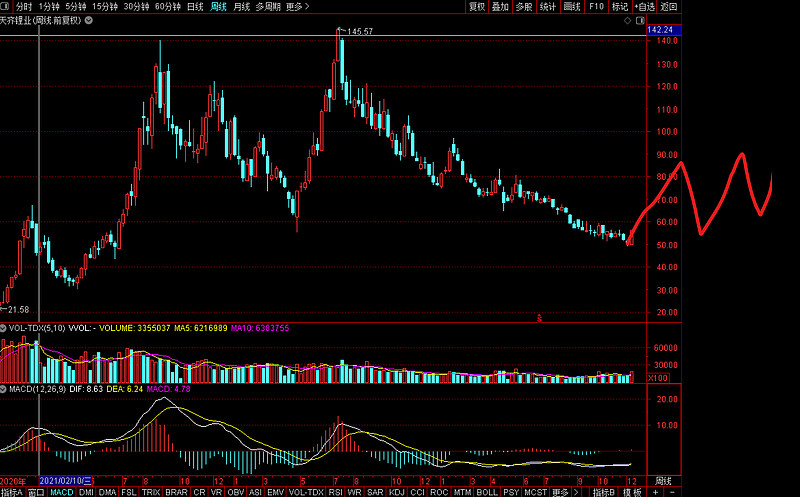 我们先看天齐锂业的走势,直接看周线级别,毕竟这个下跌也是大级别的,周线这里要形成有效反攻的话,还需要形成底部结构,而现在只是一个日线级别的反弹而已,并不能说是底部了,还需要市场走出来才行。