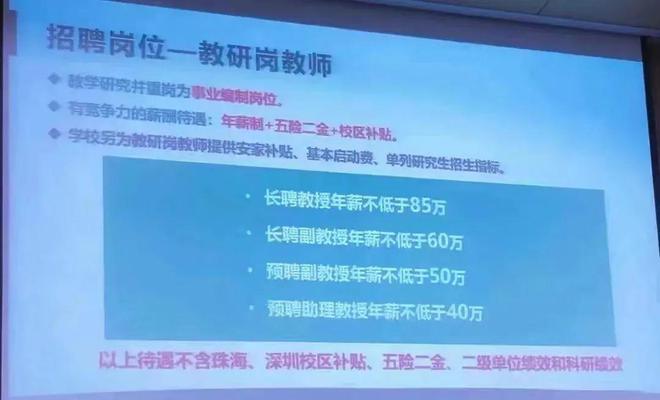 综上,看起来中山大学的教研岗教师招聘待遇很高,有年薪,五险二金,还有安家费,校区补贴,科研启动金,但是聘用期间多半拿的是试用期工资,考核要求高,非升即走,要求也不低的。