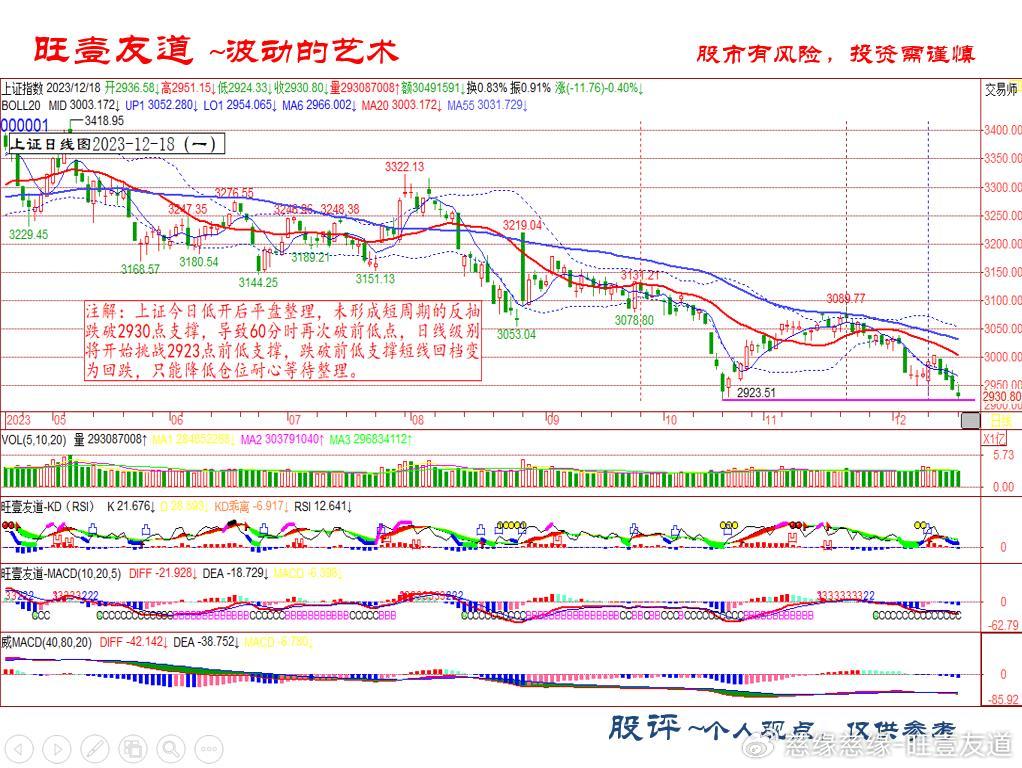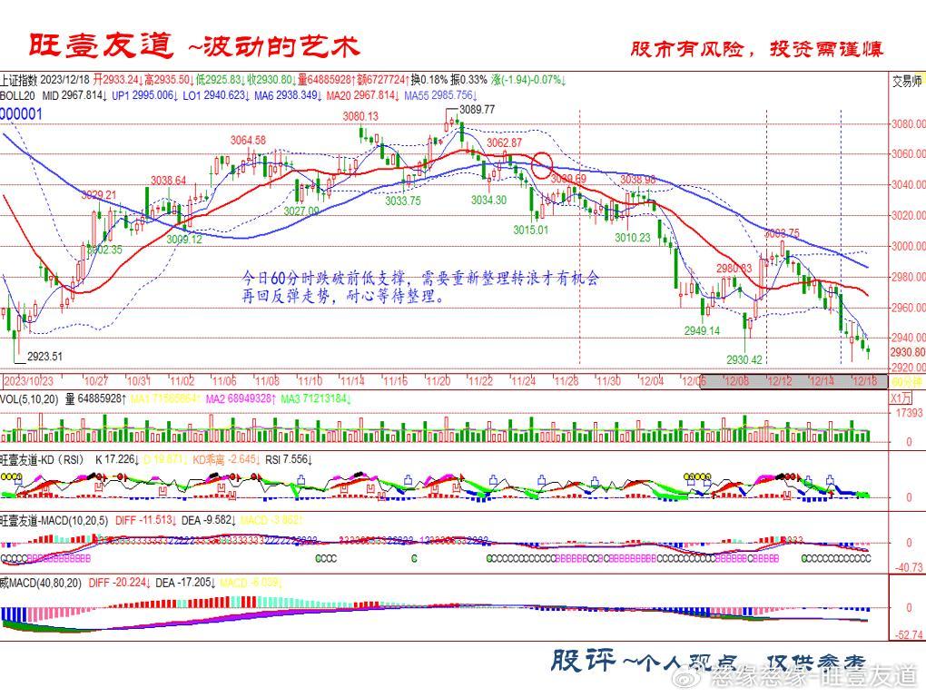 上证今日低开后平盘整理,未形成短周期的反抽 跌破2930点支撑,导致60分时再次破前低点,日线级别 将开始挑战2923点前低支撑,跌破前低支撑短线回档变 为回跌,只能降低仓位耐心等待整理。