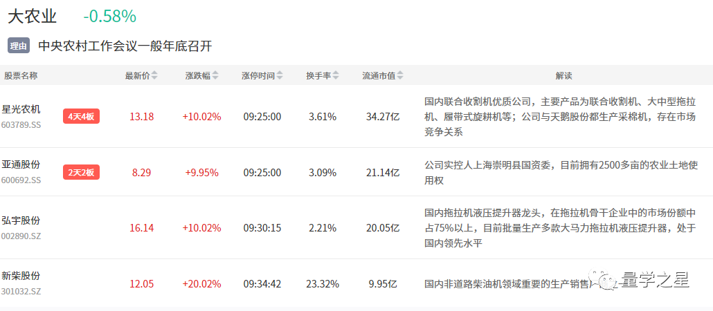 大农业板块今日异动走强,星光农机4连板,亚通股份、弘宇股份等涨停。