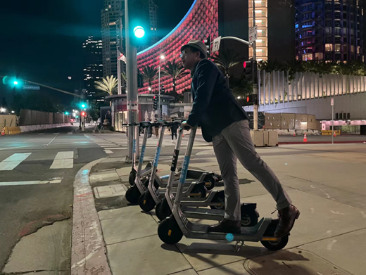 这一次在洛杉矶街头,我还看到了不少滑板车。就和国内小朋友玩的那种一样,有个撑杆、踩滑板上就能御风前行,只不过是纯电动的。