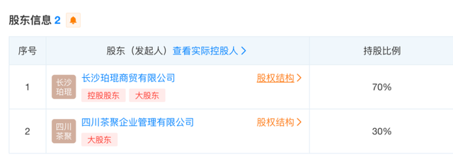 据知情人士透露,霸王茶姬在长沙的代理机构是一家新注册的合资公司——湖南茶隐茶商业管理有限公司。根据天眼查,该家公司的股东分别为长沙珀琨商贸有限公司(以下简称珀琨商贸)和四川茶聚企业管理有限公司(以下简称四川茶聚),持股比例分别为70%和30%。