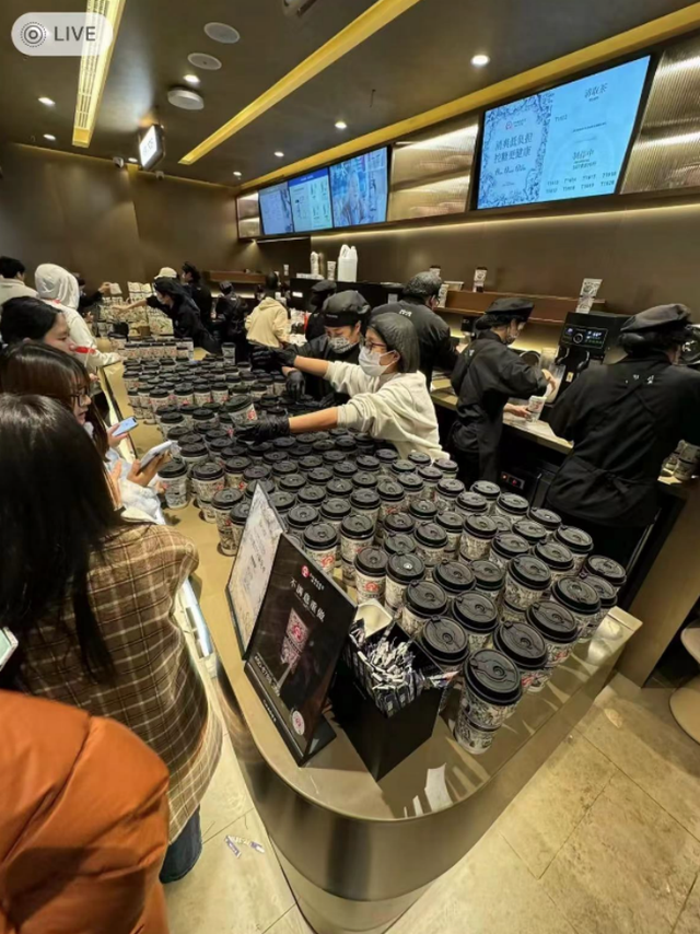 开业当天,湖南长沙国金街A层店超长取餐岛台上,乌乌泱泱地摆放着一片黑盖奶茶,握着手机等单的顾客挤满了霸王茶姬的门店,甚至溢出门店外的顾客依旧人头攒动。