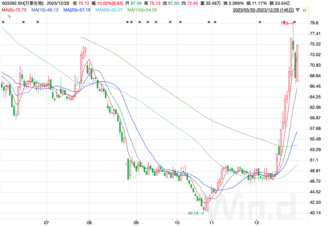 知名疫苗股万泰生物$万泰生物(SH603392)$(证券代码:603392;以下简称万泰)最近又又又又一次火了,从23年12月15日~29日的11个交易日里,股价最大涨幅超过60%,总市值一度逼近千亿,走势方面,万泰这一轮上涨中录得数个涨停板,直到23年末那几个交易日才出现了一定回撤。