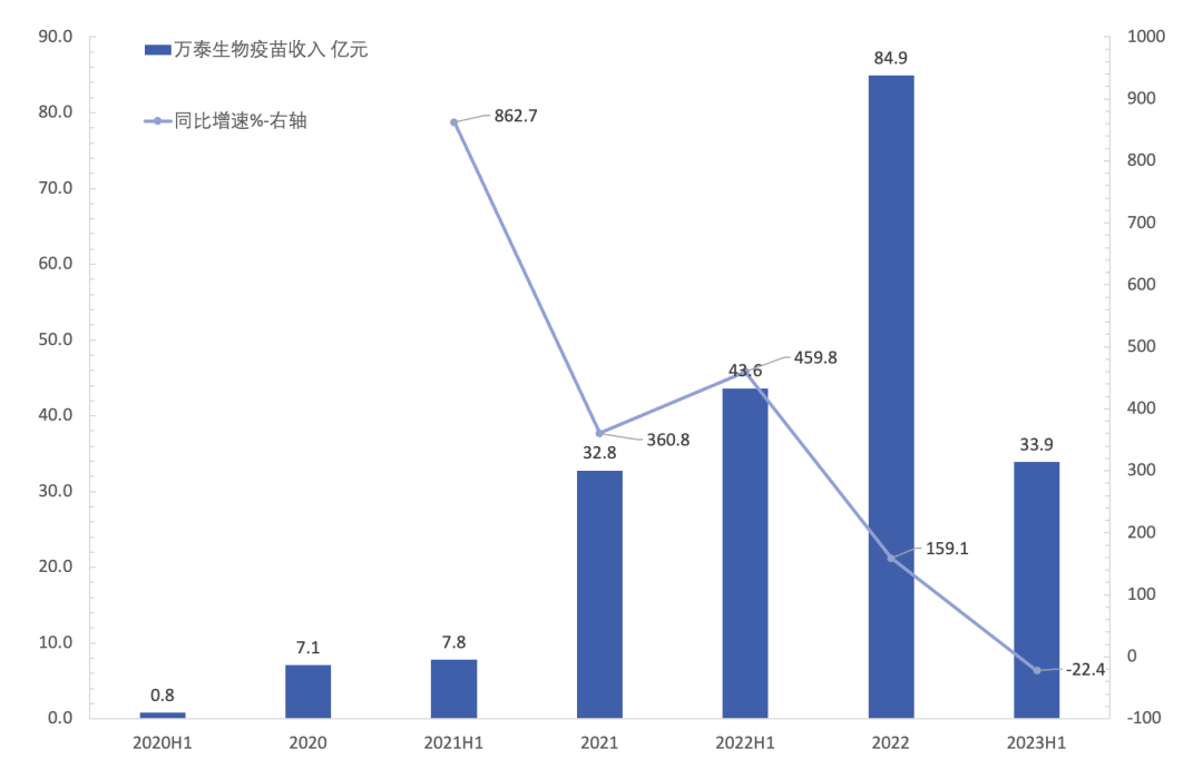 继续看万泰的基本面,回到三年前2021年,彼时二价苗刚开始为万泰贡献业绩,IVD的业务收入占据了万泰的半壁江山。在过去这三年里,万泰的疫苗业务展现出远强于IVD的成长性,截至23H1,万泰的疫苗收入已经是公司总收入的八成。