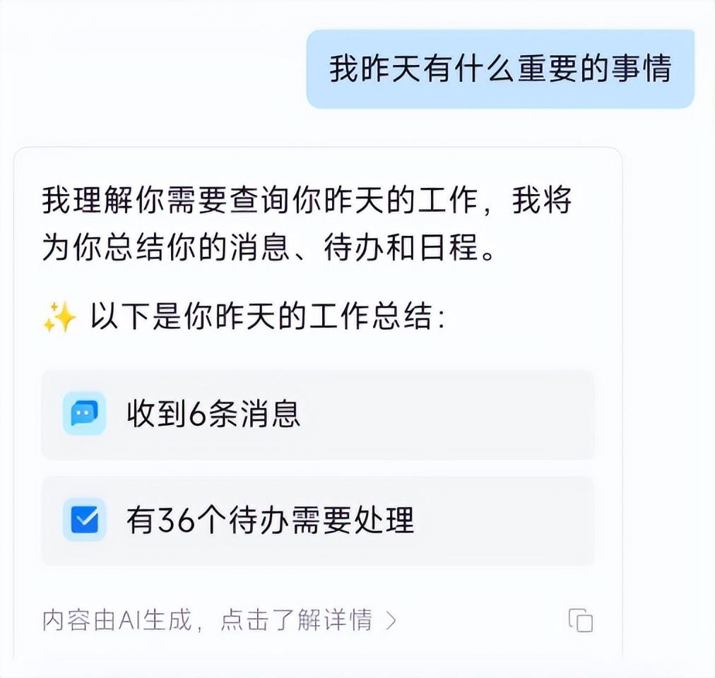 考虑到钉钉的本行是协同办公场景,AI助手对于应用内部的待办事项、日程安排、公司动态等信息的整理显得尤为重要,在AI的加持下,现版本的钉钉可以将用户在应用内消息(代办、审批、未读消息等)进行汇总。