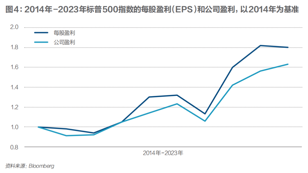 图4是2014年-2023年标普500指数的每股盈利(EPS)和公司盈利。与沪深300指数类似的是,从2014年至2023年,标普500指数的公司盈利和每股盈利也是逐步上涨的,但涨幅要比沪深300的大。另外,标普500每股盈利的上涨幅度要大于公司盈利。与2014年相比,2023年的公司盈利上涨了63%,而每股盈利上升了80%。
