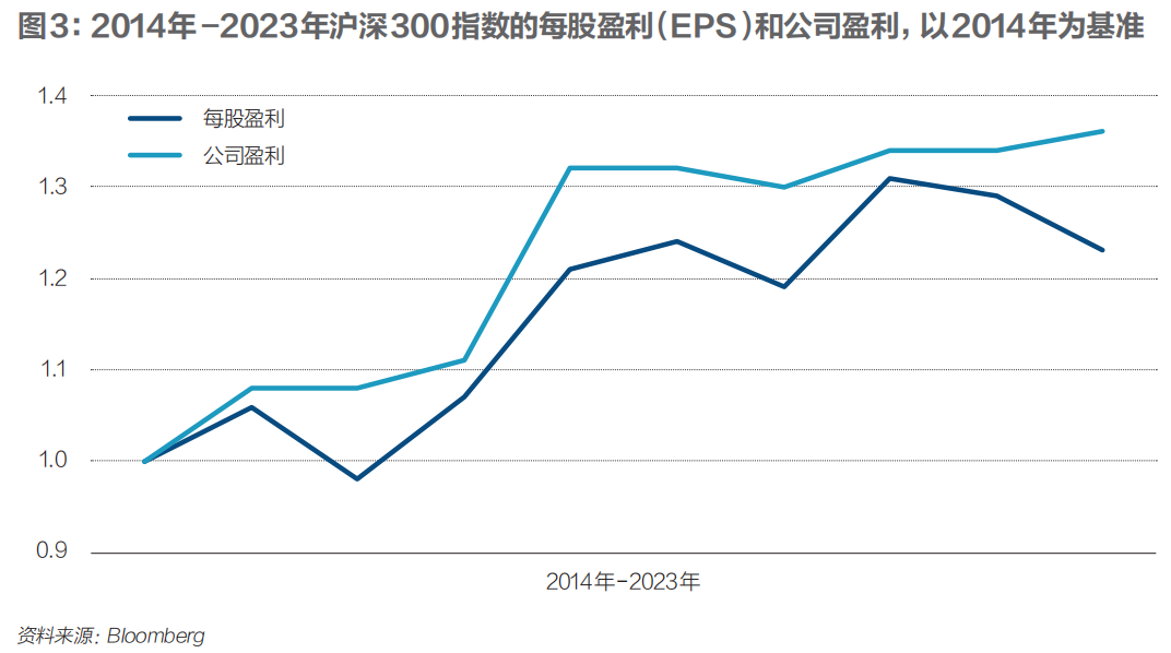 图3是2014年-2023年沪深300指数的每股盈利(EPS)和公司盈利,为方便对比起见,两个指标均以2014年为基准。从2014年至2023年,沪深300的公司盈利和每股盈利是逐步上涨的,但每股盈利的上涨幅度不如公司盈利。与2014年相比,2022年的公司盈利上涨了36%,而每股盈利只上涨了23%。