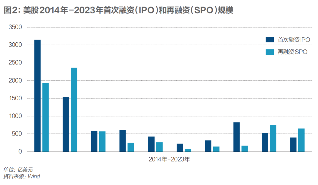 图2是美股2014年至2023年首次融资和再融资规模。与A股不一样的是,大多数时候美股IPO规模是超过SPO的。最近十年时间里,只有2015年、2022年、2023年这三年IPO规模被SPO超过。十年间,美股SPO融资7177亿美元,而IPO融资8618亿美元,是SPO的1.2倍。