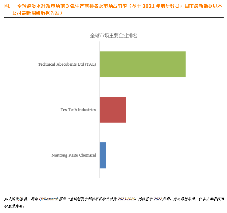 全球范围内 超吸水纤维生产商主要包括Technical Absorbents Ltd (TAL)、Tex Tech Industries、Nantong Kaite Chemical等。2022年,全球前三大厂商占有大约90.0%的市场份额。