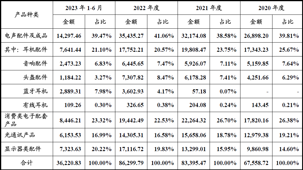 但从上表可见,发行人电声配件及成品业务中耳机配件也即耳机线,报告期内(下同)实现的营业收入分别为:1.73亿元、1.98亿元、1.76亿元以及0.76亿元。发行人的耳机线业务合计实现营收6.25亿元,占全部主营业务收入平均比例约为22.87%,排上表分类产品收入中第二位,仅次于消费类电子配套产品也即数据线品类收入。