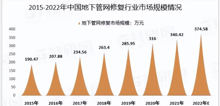 1、历史数据:我国地下管网修复行业市场规模快速增长,从2015年的190.47亿元增长到了2021年的340.42亿元,预计2022年我国地下管网修复行业市场规模增长至374.58亿元。随着智慧城市建设的大潮,我国地下管网市场迎来蓬勃发展的机遇。
