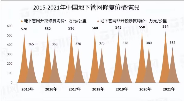 2、价格方面来看,2021年我国地下管网开挖修复均价554万元/公里,较2020年增长4万元/公里;地下管网非开挖修复均价382万元/公里,较2020年增长2万元/公里。