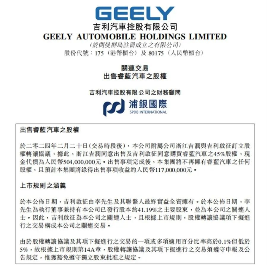 2月20日,吉利汽车控股有限公司发布公告表示,附属公司浙江吉润与吉利启征订立股权转让协议,浙江吉润同意出售及吉利启征同意购买睿蓝汽车45%股权,现金代价为5.04亿元。