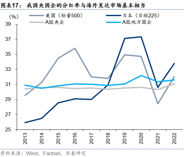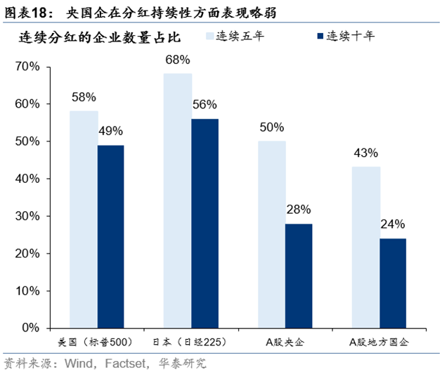 分红方面,近十年来央国企的分红率基本在30%-35%区间内,与海外发达市场基本相当;但分红持续性有进一步提升空间,连续分红10年的国央企占比不足三成,相比之下美国、日本能连续10年分红的企业占比均在五成以上,好的点在于近五年国央企分红意愿有所提升。