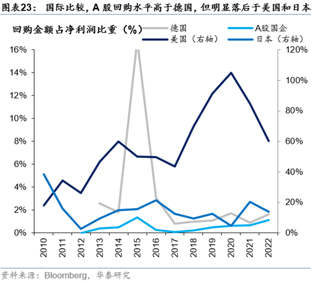 华泰证券复盘全球主要市场自2010年以来回购金额占其净利润比重,A股国企回购水平在2018年《公司法》完善回购制度以来趋势性提升,但仍不足2%,低于美国(60%)和日本(15%)。