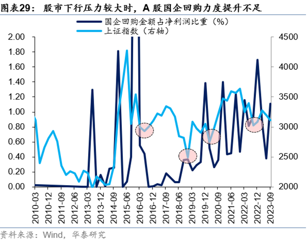 此外,A股国企的回购节奏仍有较大优化空间。“A股国企回购金额占比高峰对市场下行区间的指示意义相对略弱,且统计2000年以来的中国央国企回购案例来看,用于市值管理的案例比重只有7%,回购节奏并未较好地服务于市值管理目的。”华泰证券表示。