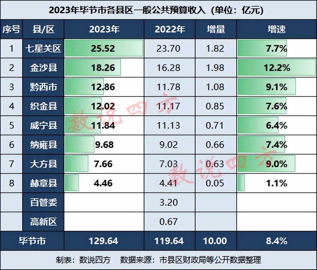 毕节市8个县区2023年都实现了财政收入正增长,除了赫章县表现低迷外,其余7个县区都实现了大涨,其中金沙县是唯一财政收入增速超过10%的县区,而黔西市、大方县的财政收入增速也都达到了9%,表现也是非常的强势。