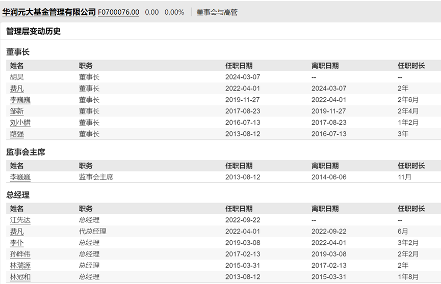 规模裹足不前的同时,华润元大的高管层也不断变换。截至目前已换了6任董事长、6任总经理,平均任职不到两年。