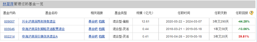 2016年4月至2019年5月,林翠萍在中海基金担任基金经理一职,管理中海沪港深价值优选灵活、中海沪港深多策略灵活两只基金,任职回报分别为39.81%、-13.06%。
