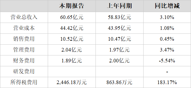 2、营业总收入同比小幅增加3.10%,净利润同比大幅增加59.84%
