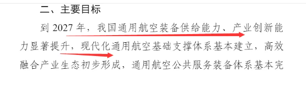 “到2027年,我国通用航空装备供给能力、产业创新能力显著提升,现代化通用航空基础支撑体系基本建立,高效融合产业生态初步形成,通用航空公共服务装备体系基本完善,以无人化、电动化、智能化为技术特征的新型通用航空装备在城市空运、物流配送、应急救援等领域实现商业应用。”