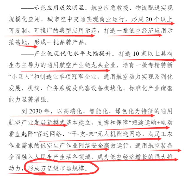 “到2030年,以高端化、智能化、绿色化为特征的通用航空产业发展新模式基本建立,支撑和保障“短途运输+电动垂直起降”客运网络、“干-支-末”无人机配送网络、满足工农作业需求的低空生产作业网络安全高效运行,通用航空装备全面融入人民生产生活各领域,成为低空经济增长的强大推动力,形成万亿级市场规模。”