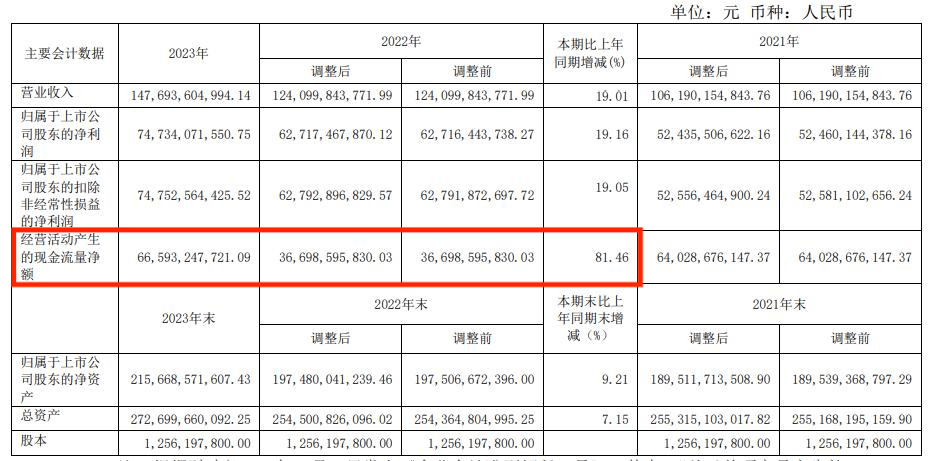 财报显示,2023年,贵州茅台营业收入为1476.94亿元,同比增长19.01%;净利润为747.34亿元,同比增长19.16%。营收、净利双增长超19%,超过了公司此前在2023年度生产经营情况中预披露的17.2%。
