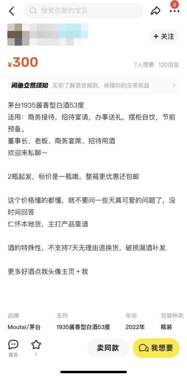 如果说上述产品且算真假存疑,在二手平台上的茅台1935假货则更为明显。在二手平台上,搜索“茅台1935”之后,多个价格为200-300元的商品出现了,且多个商品详情页面上都会标注“懂的来”等暗语。