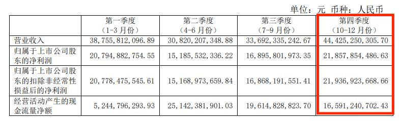 分季度来看,2023年第四季度再创新高,该季度贵州茅台营收444.25亿元,同比增长20.26%,约占总营收的30.08%;净利润218.58亿元,同比增长19.33%,约占全年净利润的29.25%。
