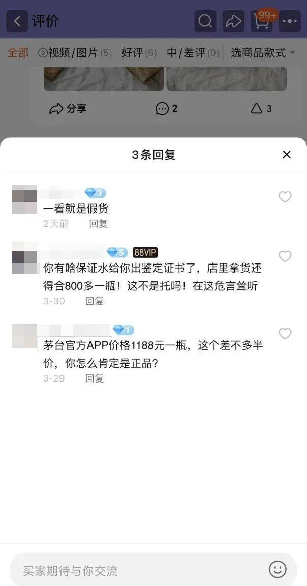 但在其中一家店铺的评价中,有消费者写到“别人推荐过来的,酒很好,正品有保障”,下方有评论称,“谁给你出鉴定证书了?店里拿货还得合800多一瓶,这不是托吗”“茅台官方App价格1188元一瓶,这个差不多半价,你怎么肯定是正品?”