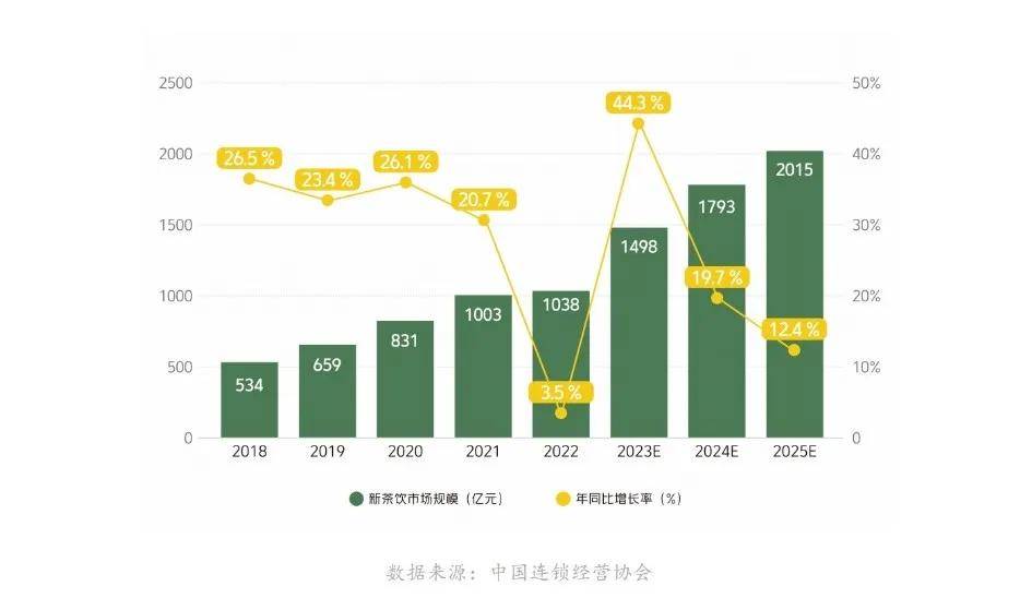 放大到整个行业,中国连锁经营协会与美团联合发布的《2023新茶饮研究报告》显示,我国新茶饮消费市场规模从2018年的534亿元,至2021年稳步踏上千亿规模(1003亿元),但之后增速显著放缓,整个市场进入盘整期。