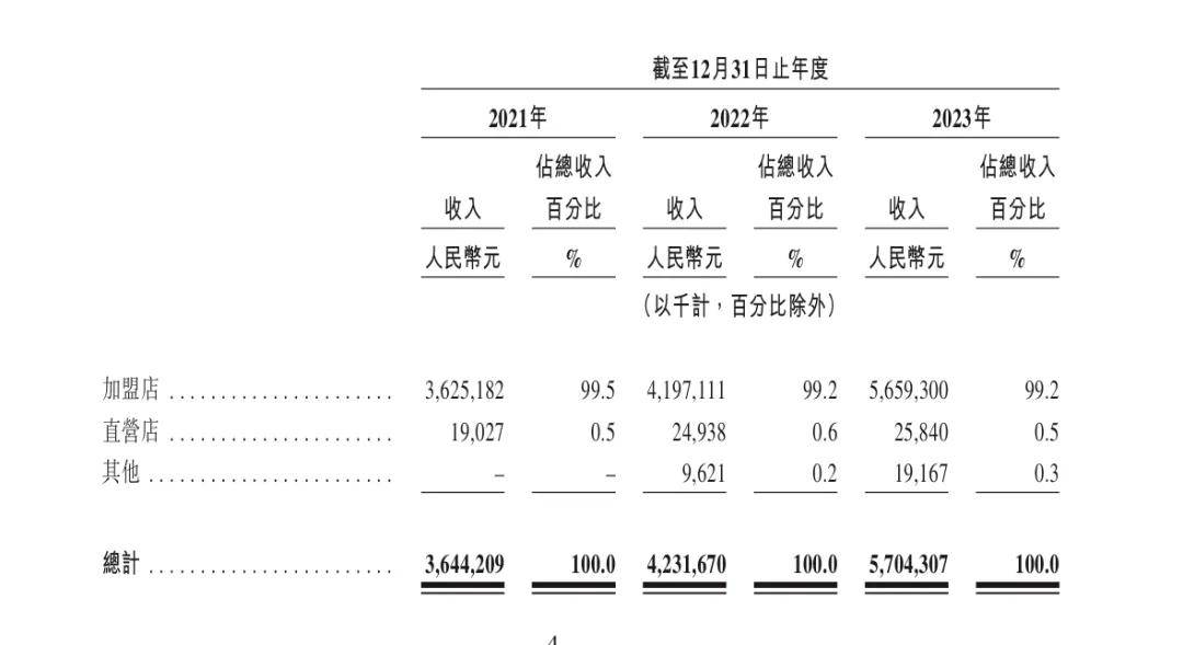 茶百道的绝大部分收入来自向加盟店销售货品及设备,以及向加盟商收取的特许权使用费及加盟费。2023年,加盟店贡献了茶百道99.2%的营收。直营店营收占比仅0.5%,毛利更是只占0.2%。