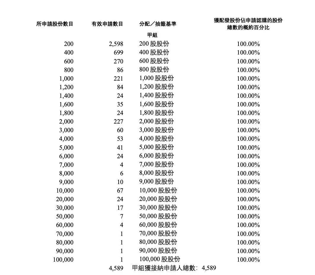 根据茶百道招股文件显示,茶百道股票发行中签率是100%,意味着只要散户打新就可获得分配。其中,甲组打新人数一共有4589人,有1人最高中签数量为10万股,意味着这位散户目前打新账面收益亏损62.8万港元。