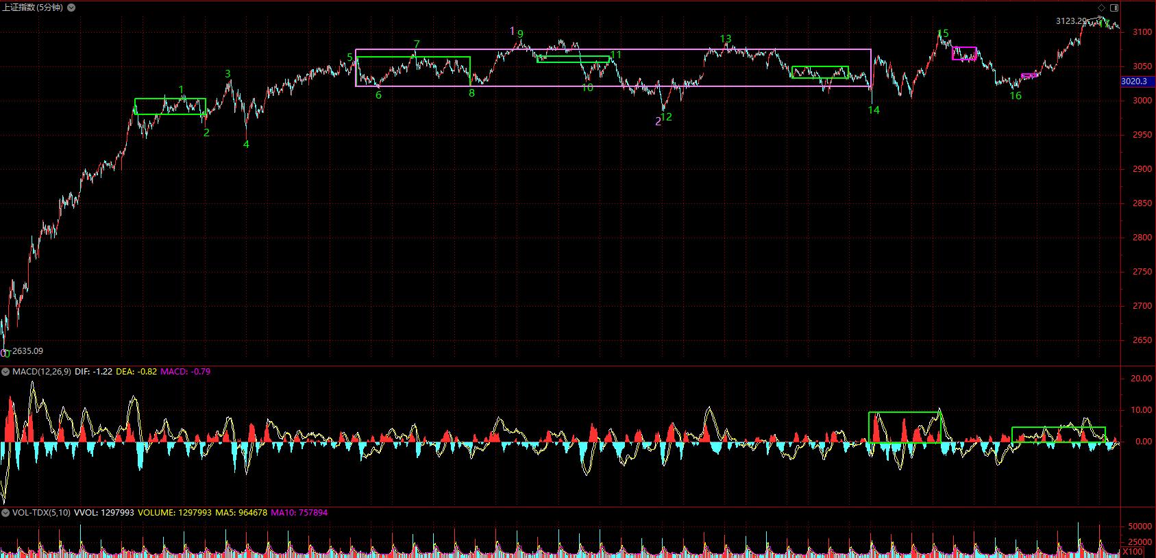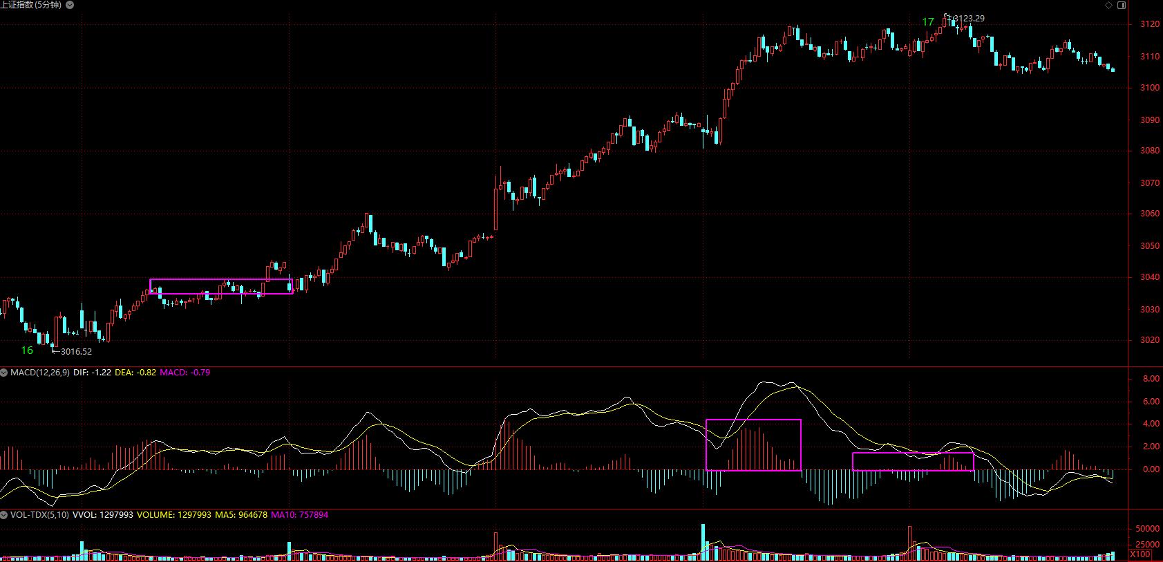 1)16-17这5分钟级别线段内部的1分钟级别盘整背驰,无论在1分钟还是5分钟图上都是很容易判断的(见下图一及图二1F及5F图上MACD红柱子面积之和对比)。