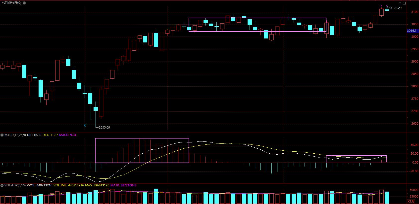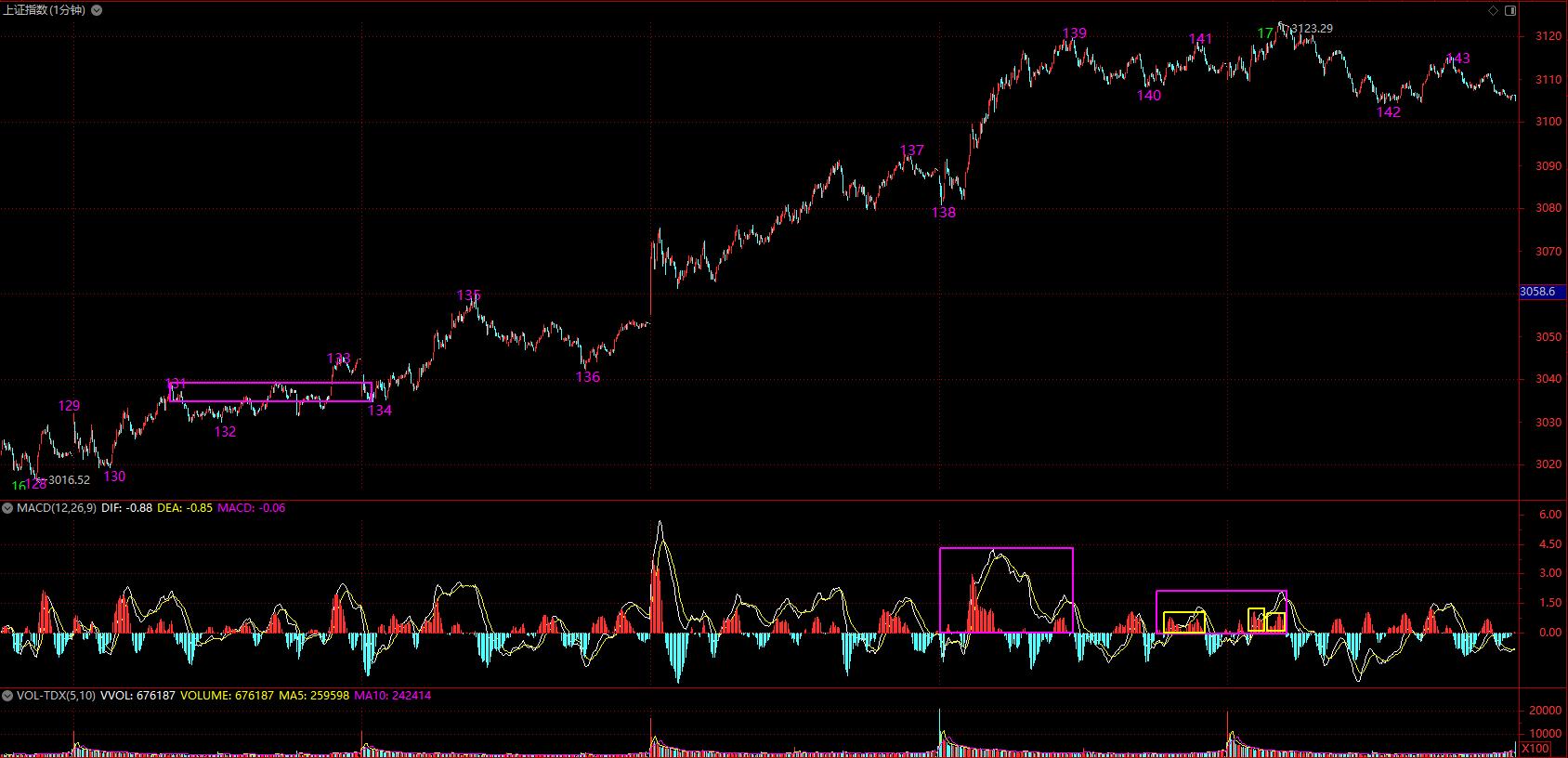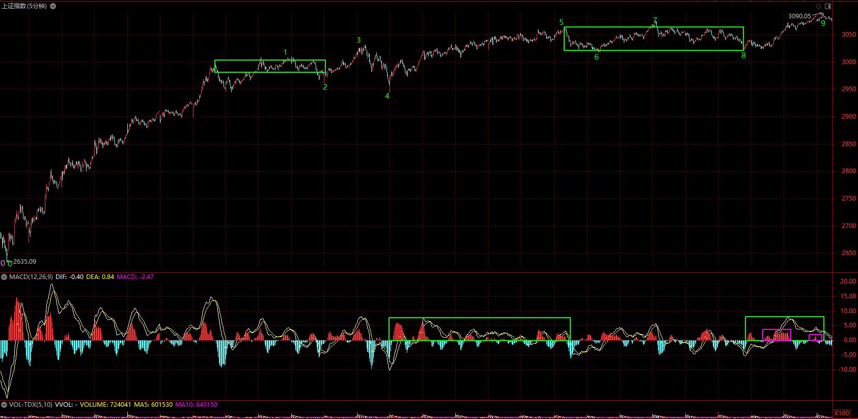 8-9与4-5的5F级别盘整背驰是很容易当下判断的,这个区间套足够标准,看下图8-9这段内部的MACD力度对比以及8-9与4-5这两段之间的MACD力度对比就知道了。这里之所以说8-9与4-5是盘整背驰而不是趋势背驰,还是之前说的,8-9这段连5-8这中枢的第三类买卖点都没出现,也就是连该中枢都还未结束,是根本谈不上趋势背驰的,只能是围绕该中枢震荡的两段走势之间的盘整背驰比较。