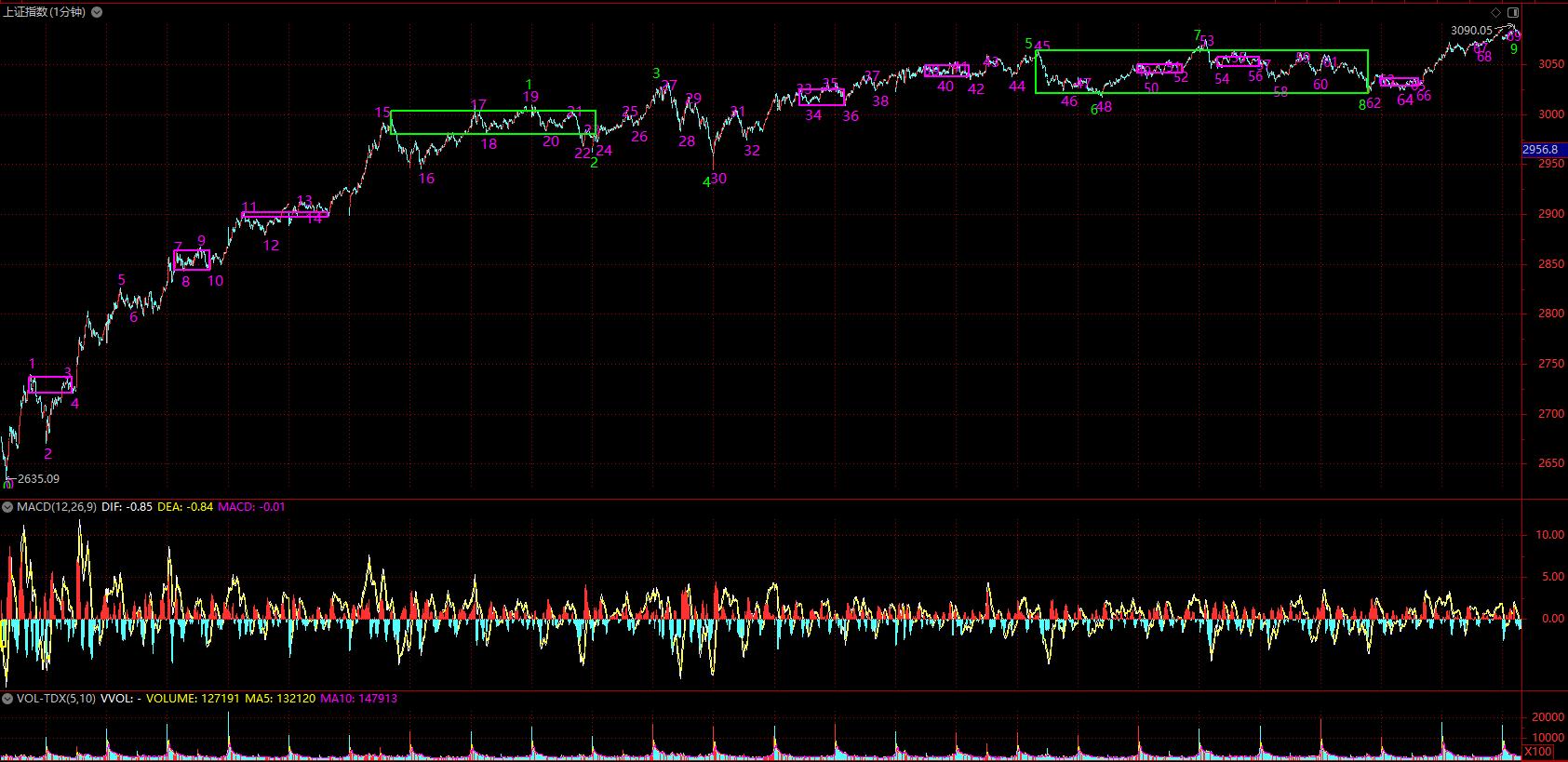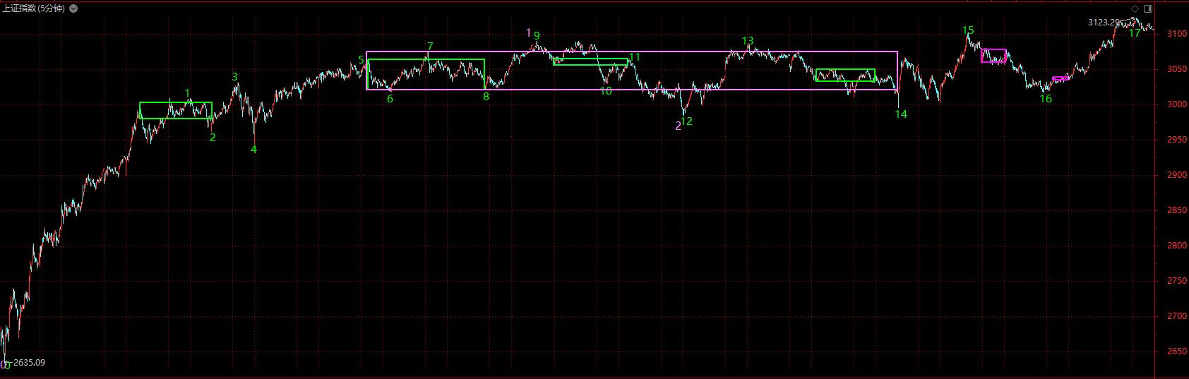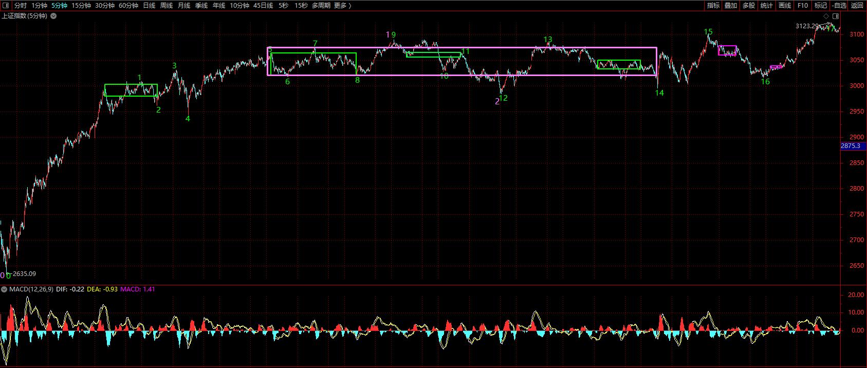 站在5-14这30F中枢的角度,14开始到目前的走势就是对该中枢的5分钟向上离开,接下来关键就看这5分钟向上离开什么时候结束: