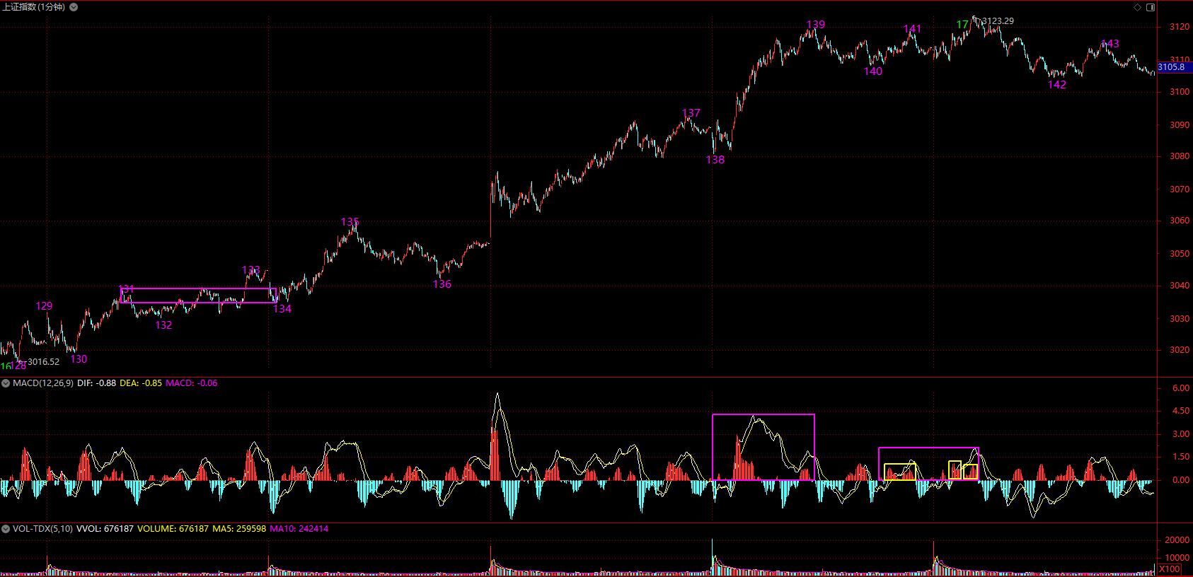 日线的均线系统上看,年线(250日线)的重要性不言而喻。目前刚站上该线,但要确认该线是否有效突破,一般来说也会有一个回抽确认能否站稳——或者跟上面分析的一样,在此处是形成139-142这1F中枢的第三类买点还是卖点,以及一旦形成第三类买点,其后能否形成非背驰类向上;一旦形成第三类卖点,一定不能形成非背驰类向下——的问题。