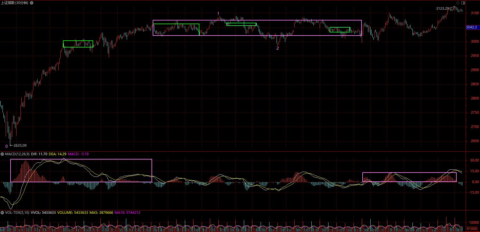 接上篇。接下来需要观察的就是各级别上由2635这日线级别盘整背驰点上来至目前为止的走势变化。