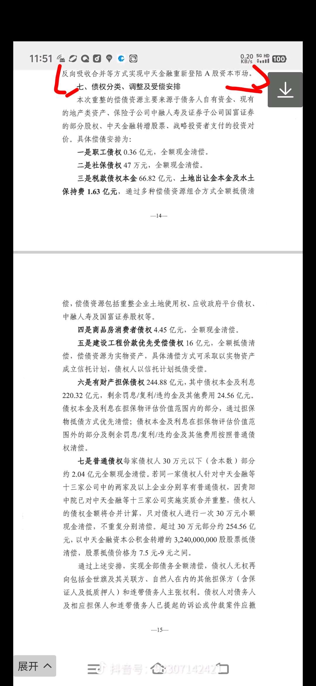 网上大神传的这张图片有点意思,截图刚好没截到哪家子公司?怎么个反向吸并?(或者有人猜测的购买重组华夏失败,被现瑞众反向吸并,当然这是重大利好,鉴于70个扑朔迷离,也不是完全没可能,但概率有点渺茫吧),这些关键内容刻意隐蔽或许涉及到保密,也或许子虚乌有,毕竟只是网传,但公告了的专业人干专业事可以明确金融与地产剥离,那么中公司的金融类国富证券和中融人寿反向吸并也是可能的,虽然体量小,但还有神秘的战投!战投弱没多少想象空间,只能算抢救成功,战投强迎合做强大金融、头部券商政策导向,所以目前最重要的就是重整及战投的公布,战投实力决定中天是否实现真正意思上的重生!
