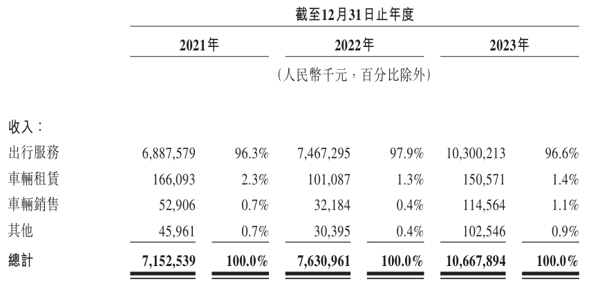 究其根本,是激烈的市场竞争之下,网约车平台陷入了同质化竞争,企业运营成本居高不下。 除了平台的开发维护、车辆购置、司机的招募和培训等等一系列固定支出之外,为了争夺用户和司机,各家不得不疯狂烧钱补贴。根据招股书,2021年到2023年,曹操出行销售成本分别为89亿元、79.7亿元、100.52亿元,其中占大头的就是出行服务的司机收入及补贴,三年里分别为72亿元、62.85亿元、81.46亿元。再来看曹操出行的收入来源,虽然近些年来,它也一直在探索多元化的盈利模式,但直到目前为止,出行服务仍是其支柱性业务。报告期内,曹操出行的营收分别为71.53亿元、76.31亿元、106.68亿元,其中出行服务收入占比分别达到了96.3%、97.9%、96.6%。