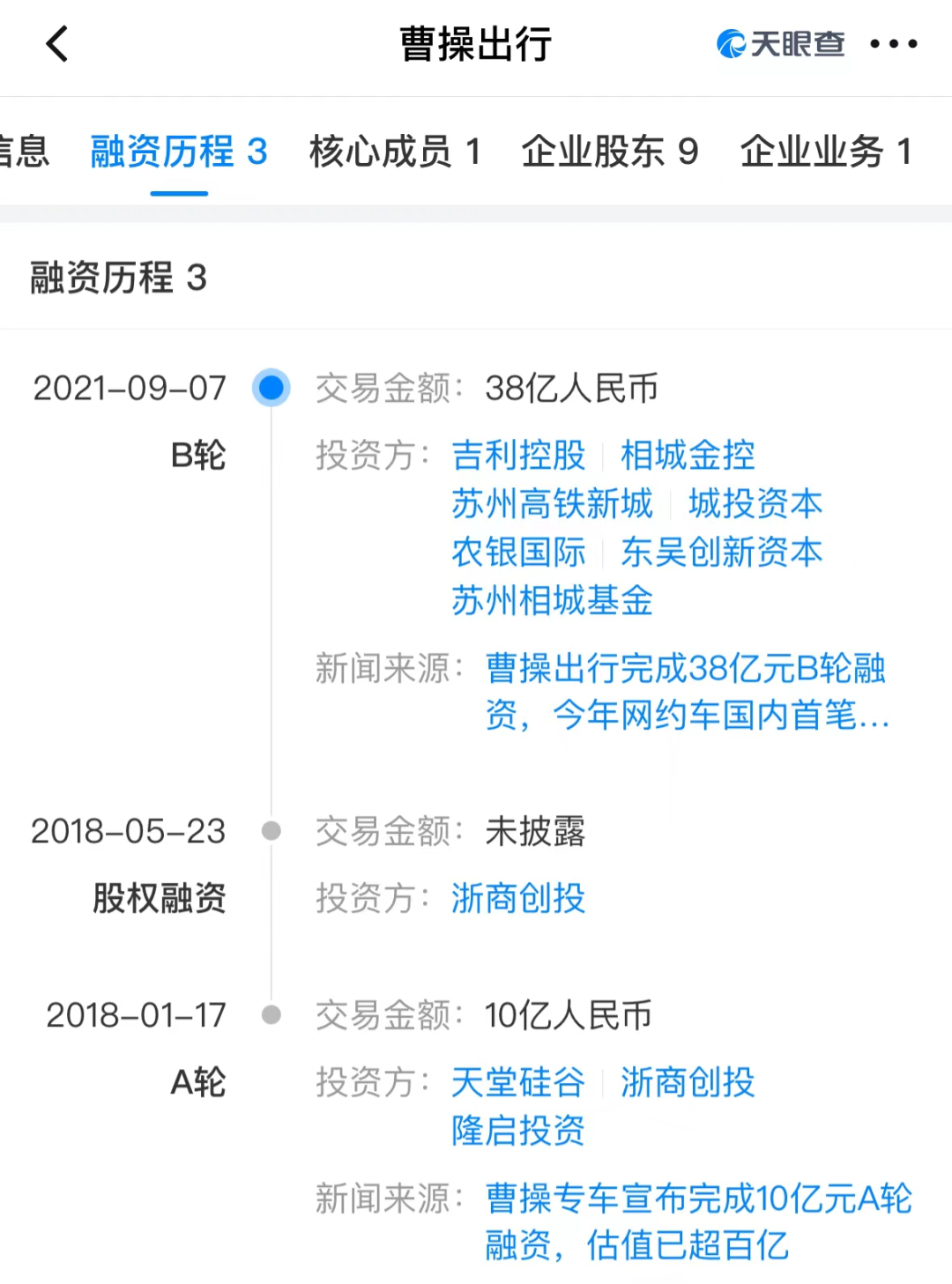 各种找钱,谋求新的想象力自我造血能力不行,向外找“钱”途就成了必选项。天眼查数据显示,截至目前,曹操出行一共完成了三轮融资。但最近的一笔,已经是2021年的事了,当时它获得了吉利控股、相城金控等公司的38亿元B轮融资。3年过去了,曹操出行也亟需新的外部输血。