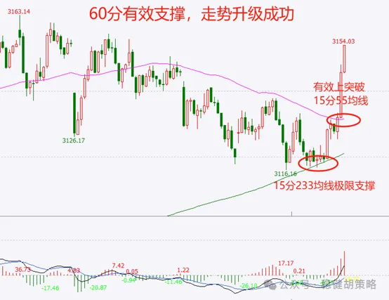 1、市场还是选择了最标准的走势,也完全符合我们对于本轮走势的预期,最近两天可能有些许煎熬,但是到股指交割日的最后一刻还是选择向上突破,并如我们所预期大阳线的方式。60分节奏的支撑有效,那么上涨也就必然升级了,也就是说大盘指数会上破3163的前高点,做本轮行情最后的冲刺。